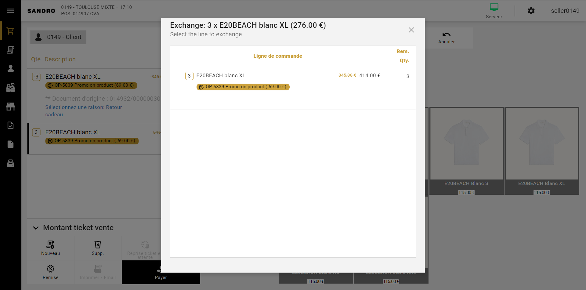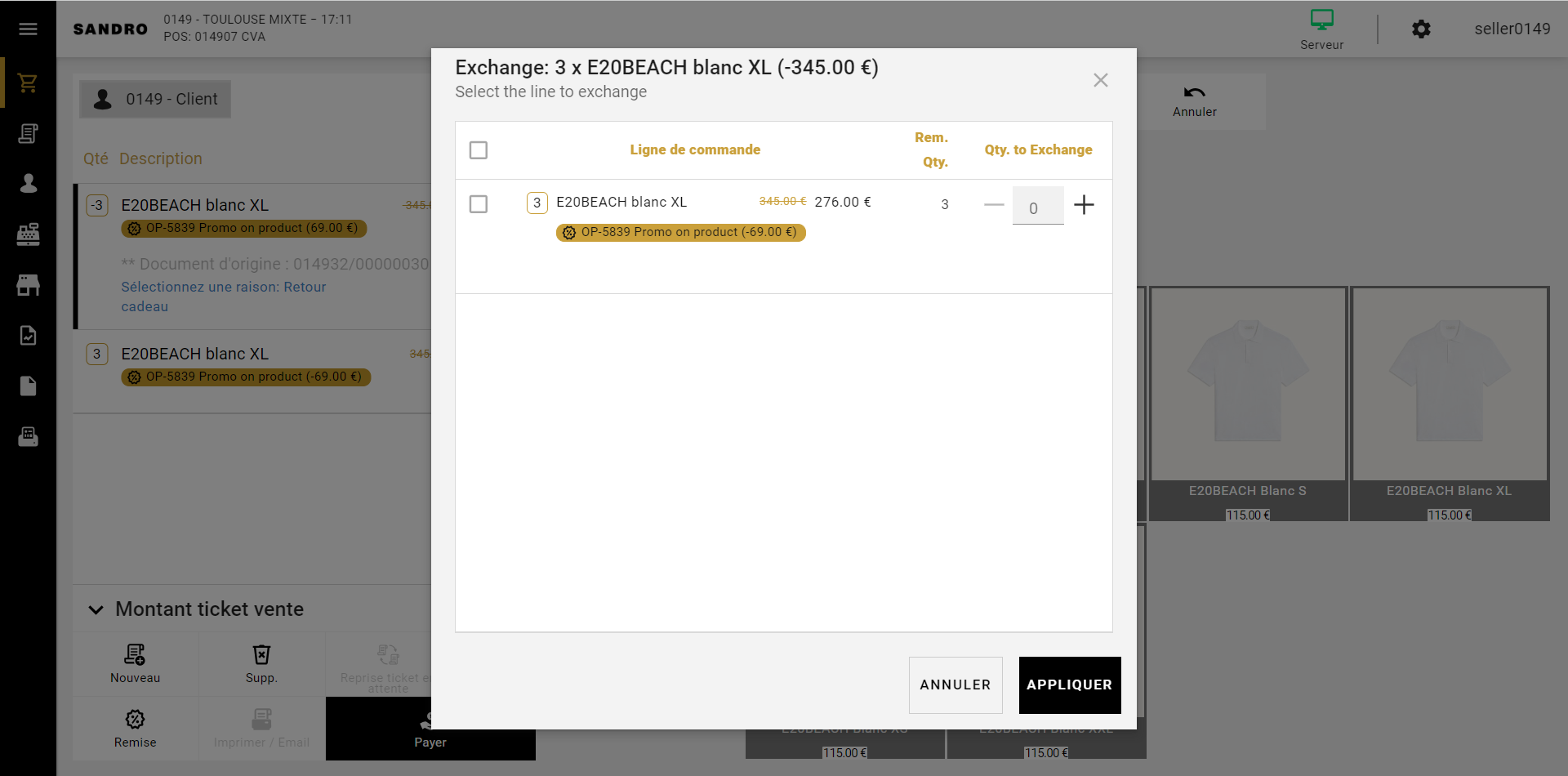 | Steps To Reproduce | Enable product exchange for the same price in the required touchpoint type Login in POS with a correct user on the channel touchpoint Finalize a sale of a product A in quantity N > 1 Create a complete verified return on the previous sale Add the same product A in quantity N (same price as P1) Click on the product line of the product added Click on 'Exchange' => A pop-up is displayed asking to select a product, but there is only one product in the list (See POS One product availble - select product from positive line.png) Same when clicking on the product to be returned => A pop-up is displayed asking to define a quantity to exchange, but there is only one product in the list (See POS One product availble - select product from negative line.png) If there is only one available product for the exchange in the ticket, we should have a confirmation pop-up (See POS One product availble - confirmation exemple.png) (Cannot show a screenshot from Livebuilds because product exchange is actually KO - see POS Exchange product KO.png) | |||||||