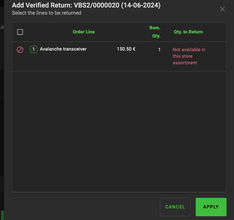 DescriptionIf I make a cross store return on a store where the product to return is not in the store price list, the verified return is not allowed. A message on the line says that the product is not in the assortment.