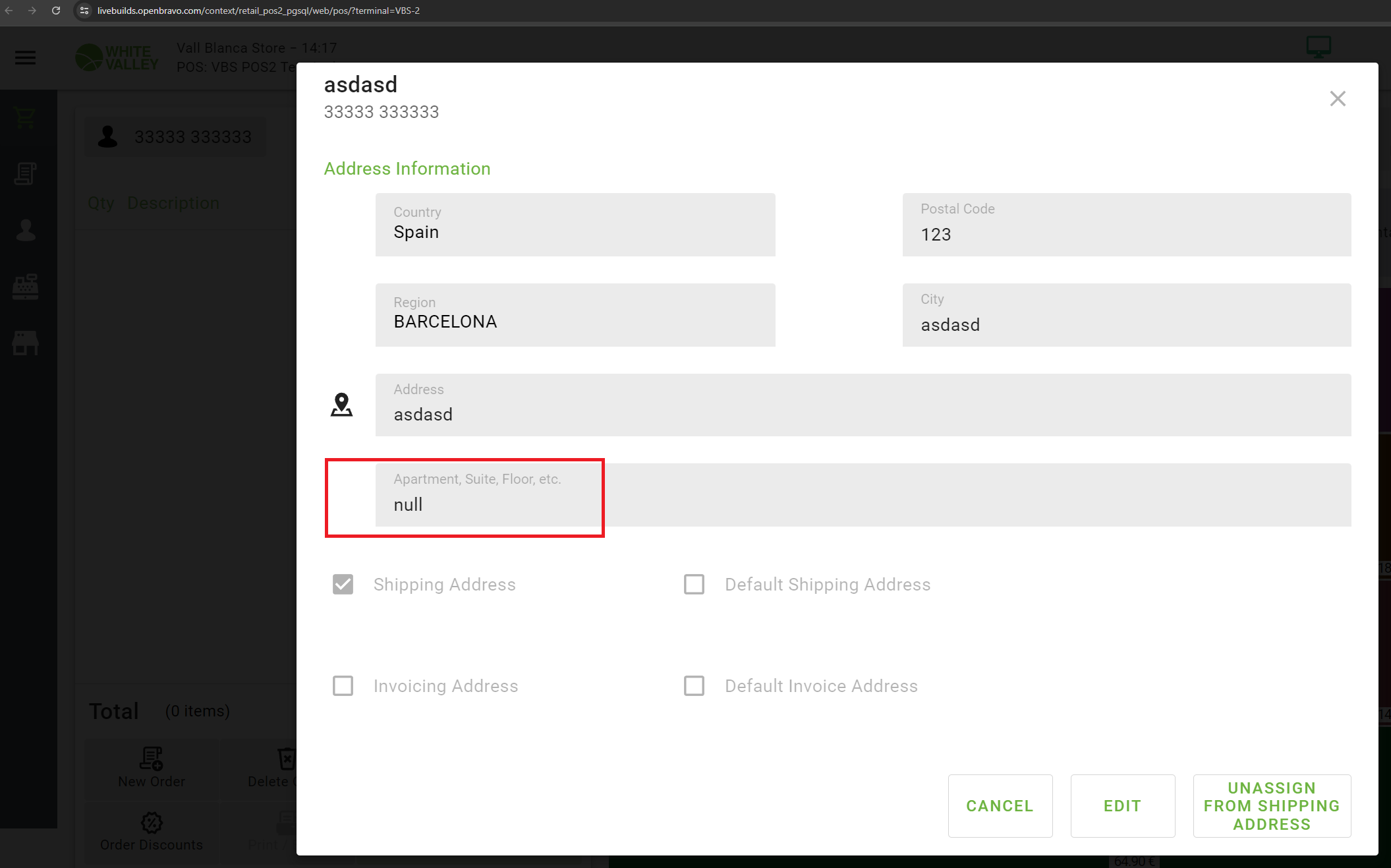 | Steps To Reproduce | 0-Login POS2 as vallblanca. 1-Click in VBS Customer and click "New Customer" button. Create a new customer with any values and click "Save And Assign" button. 2-At the top of the present receipt, click the just created and assigned client and click "View Info". 3-Inside that popup, click "Manage Address(es)" tab and click "New Address". 4-Fill "Postal Code", "City" and "Address" input fields with any values. Click Shipping Address checkbox and click "Save And Assign" button. 5-Now go again to "Manage Address(es)" tab and select the just created Address. Realise everything seems to be ok. Close all the popups and go to the main POS2 screen. 6-In the gear button, click Refresh masterdata button. 7-At the top of the present receipt, click the just created and assigned client and click "View Info". Go to "Manage Address(es)" tab, select the just created address and realise NULL value is shown in the "Apartment, Suite, Floor, etc." input field. | |||||||