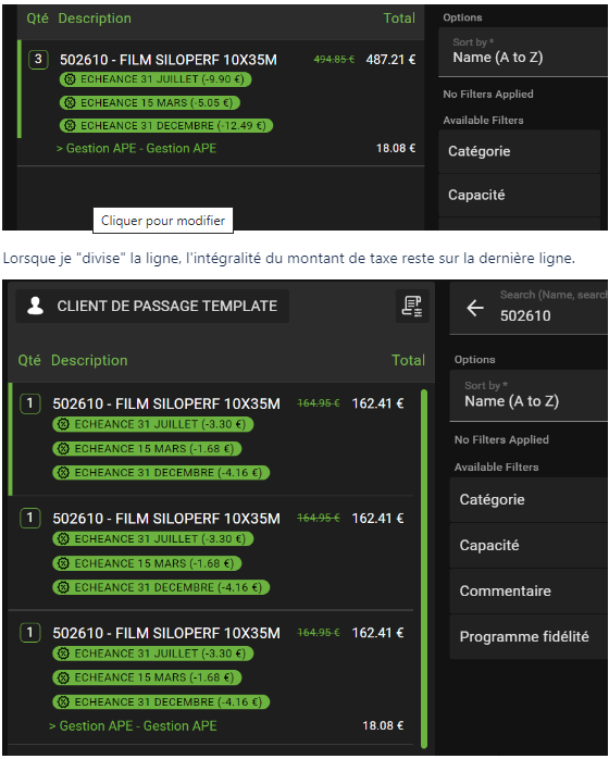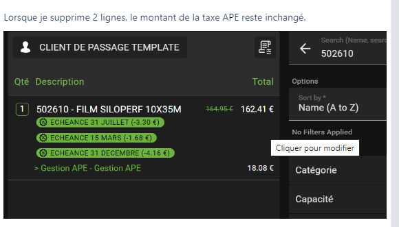 | Steps To Reproduce | Use a contribution (Product subtype) defined like as follow : Checkbox Linkable To Product selected Checkbox Forced in returns selected Price Calculation > By Product multiplicator Quantity Rule > As per product Allocation Type > mandatory --------- This contribution is assigned to a product ---- Select product with quantity of 3 When the line is splitted the contribution line is not recalculate ---- When 2 of the previous lines are deleted, the contribution is not recalculated for the only line present. The result shlould be a contribution (Gestion APE) with an 6.02 € like amount | |||||||