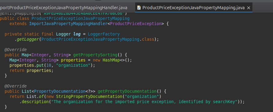 | Proposed Solution | Make by default the nullable to false and include a explicit nullable set for the: IMPORT PRODUCT PRICE EXCEPTION - organization IMPORT INVENTORY LINE: - bin Example: @Override public List<PropertyDocumentation<?>> getPropertyDocumentation() { return List.of(new StringPropertyDocumentation("organization") .description("The organization for the imported price exception, identified by searchKey").nullable(false)); } | |||||||