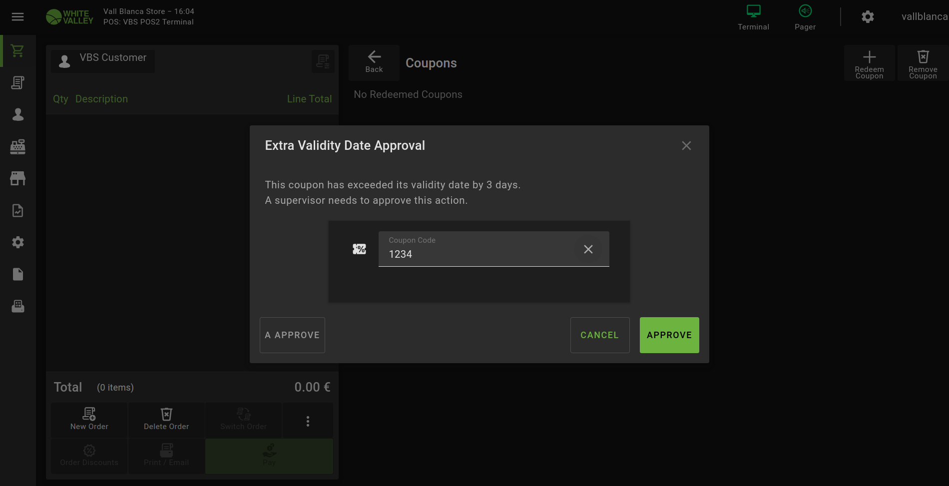 When a cashier attempts to apply a coupon that has expired but is within the extra validity days, the system correctly prompts for approval. However, the approval dialog that appears does not display fields for the approver's username and password. Instead, it displays a field to re-enter the coupon.