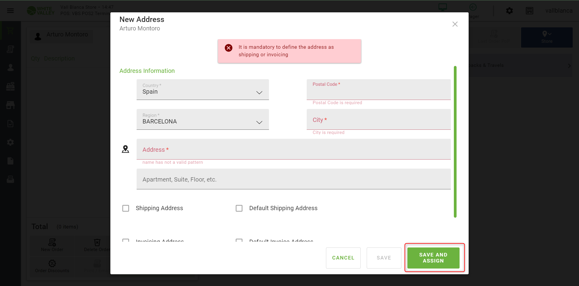 | Description | 'SAVE AND ASSIGN' button should be greyed out on creation or modification of a customer address when a mandatory field is not filled | |||||||