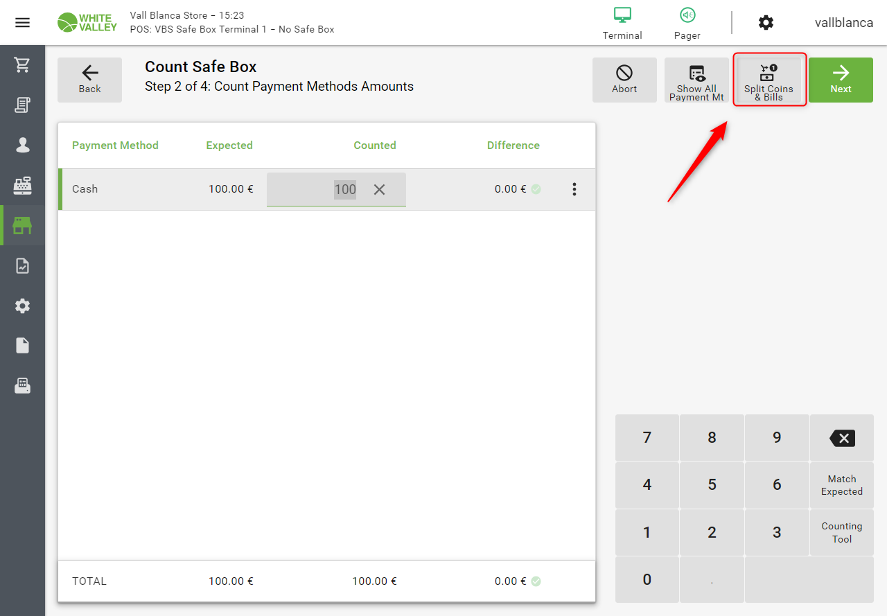 DescriptionOn POS2, it's not possible anymore to split coins and bills when couting cash on safebox.