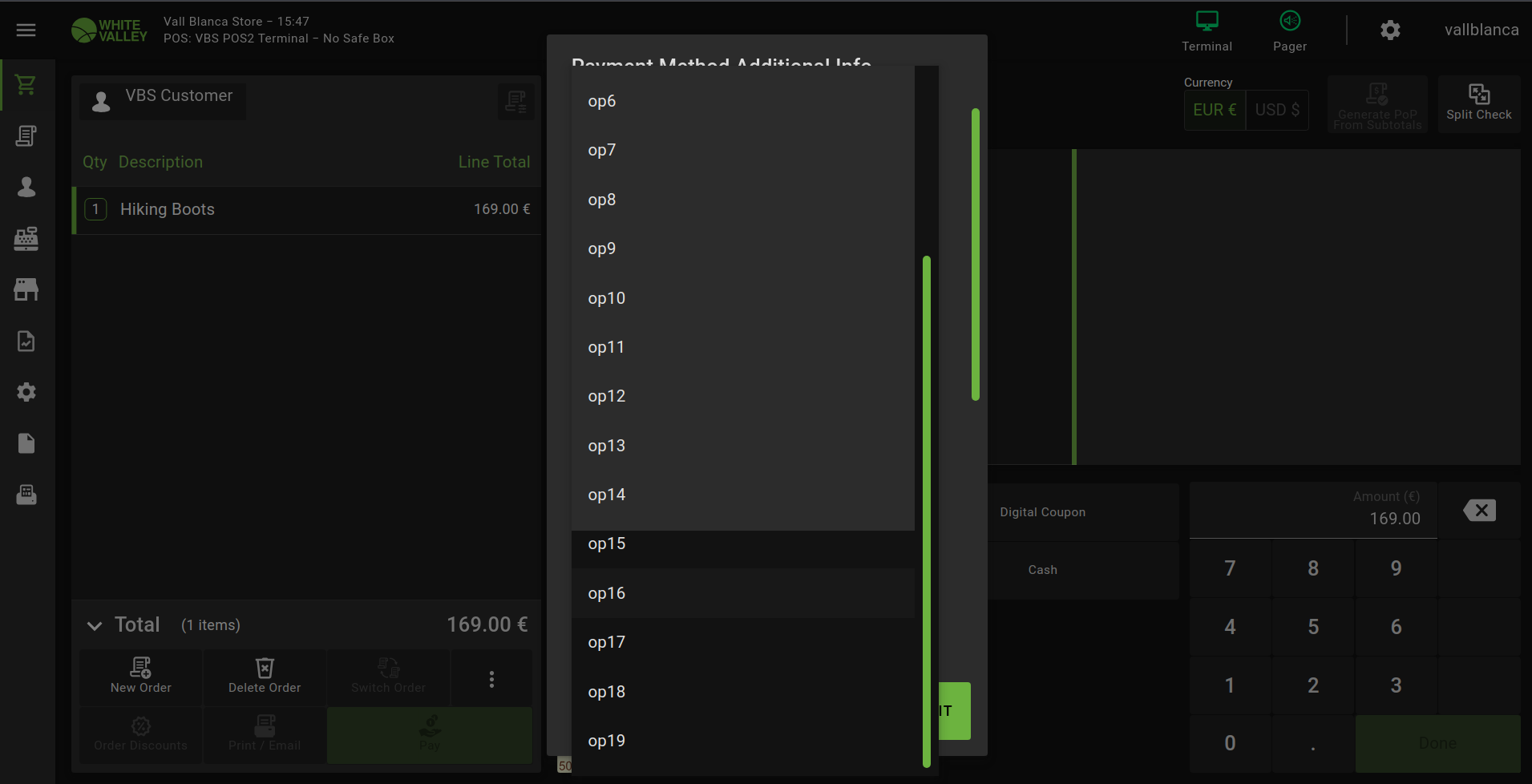 | Steps To Reproduce | BackOffice Configuration: - Navigate to the "Channel Touchpoint Type" window. - Select the "POS2SD VBS POS2 Terminal Type". - Go to the "Payment Method" subtab. - Edit the "Cash" payment method. - Enable the "Additional Information" flag. - Save the changes. - Still in the "Payment Method" subtab, navigate to "Payment Method Additional Info". - Create a new record with the following details: - Name: Field1 - Search Key: Field_1 - Required: checked - Type: Combobox - Active: checked - Save the record. - Switch to the "Values" subtab. - Create 15 new records named "op1", "op2", ..., "op15", with the corresponding search keys. POS steps: - Login POS - Add a product to the ticket - Click "Pay" button - Select "Cash" as payment method, the "Payment Method Additional Info" popover will be shown - Unfold the options for the "Field 1" and scroll down. After the 13th option, the color of the options is different. | |||||||