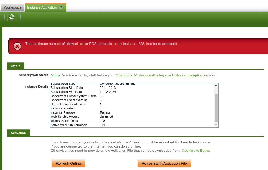 | Steps To Reproduce | -Have a licensed environment active and check the limit of active WebPOS. -Activate a number close to the limit, e.g. if the limit is 228, have 227 active terminals. -Run the Copy Retail Store, you will see that the process finishes correctly. -Log out of the Backoffice and log in again, you will see an error message informing you that the limit of active terminals has been exceeded and you will only be able to log in as System Administrator. | |||||||