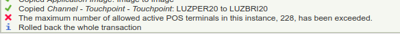 | Description | If you are close to the limit of active WebPOS that your license allows, you run the Copy Retail Store, and the amount of WebPOS to copy exceeds this limit, it will not report the problem or interrupt the process, it will continue and block the back office for exceeding the limit. We have been testing and verified that the only way where you are currently notified of the error of the terminals is when you have the limit of active terminals at the moment of launching the Copy Retail Store process, at that point you will be notified of the error, however if you have one less than the limit, the process will continue and will create more than the limit, thus blocking the backoffice. | |||||||