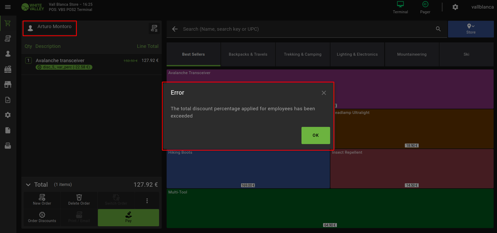 | Steps To Reproduce | 1. Go to POS 2. Assign the selected Customer to the Order 3. Add the product to the order 4. Click the product line 5. Push 'Discount' option 6. Click 'disc_5_ var_perc' discount 7. Introduce 15% as a discount value → Push 'Apply' button 8. Pay attention to the displayed error stating that total discount percentage applied has been exceeded 9. Push 'Ok' button → Add another product without any discount 10.Push 'Pay' button Actual result: The Employee Discount Threshold is ignored and the order can be completed | |||||||