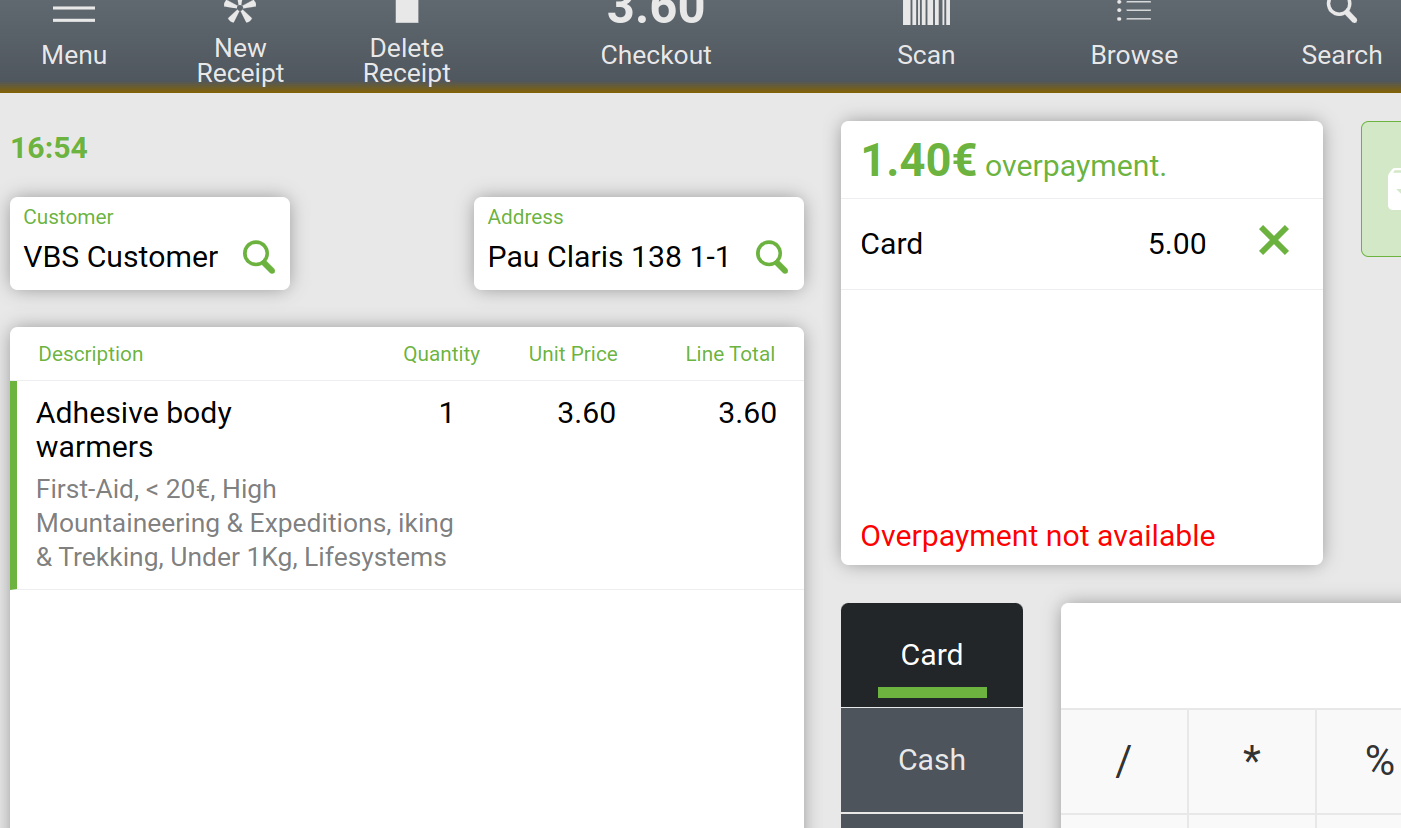 | Steps To Reproduce | BO: . Touchpoint Type: Credit Card: - Payment provider: Legacy Payment Provider - Overpayment / Change Limit: 0 POS . add Adhesive body warmers: total ticket 3.60 . click in total button -> payment tab opened . Card: 5 -> enter button -> Payment using card was added with 5 -> Overpayment not available message is displayed, but the payment was added | |||||||