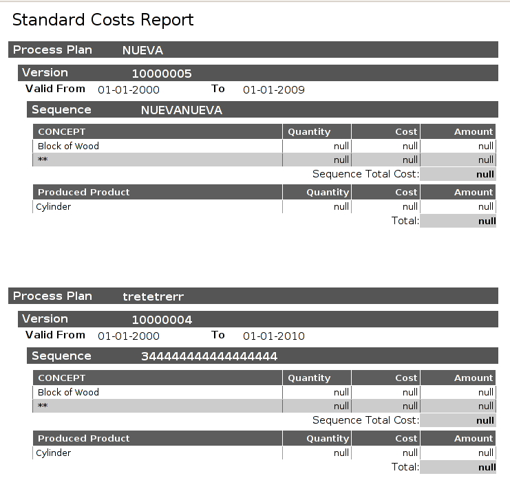 | Steps To Reproduce | 1) Create a Plan: Production Management || Transactions || Process Plan 2) Create a Work Requirement: Production Management || Transactions || Work Requirement 3) Create a Work Effort: Production Management || Transactions || Work Effort 4) Select the previous created data in 'Production Management || Analysis Tools || Standard Costs Report' and run the report. | |||||||