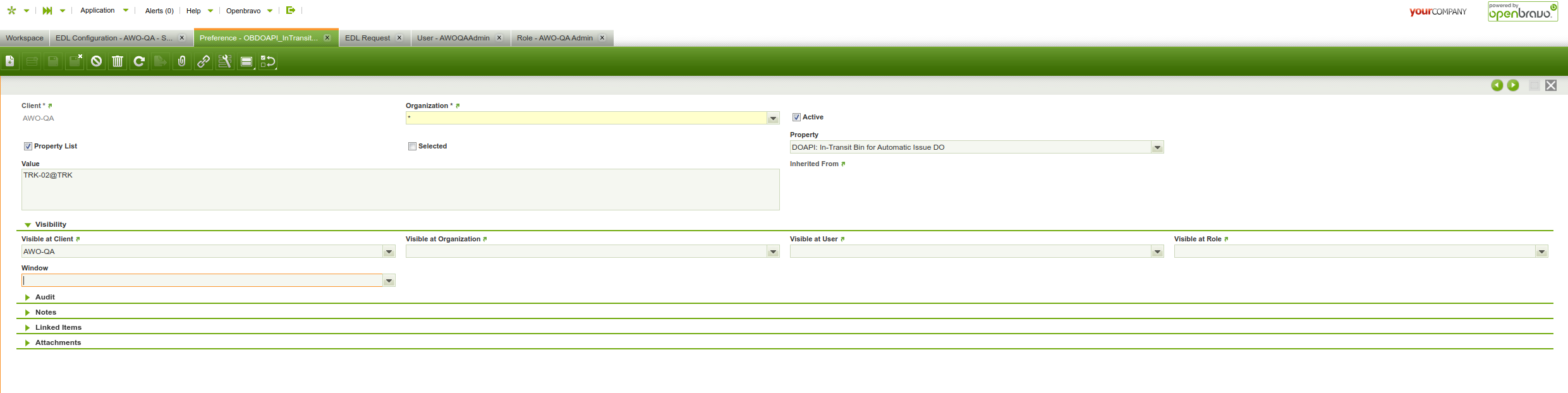 | Steps To Reproduce | Set the "DOAPI: In-Transit Bin for Automatic Issue " preference as TRK-02@TRK Set EDL Configuration Set the Event Subscription "Update DO qty through goods movement not triggered by API"" 1)Send the DOR through the API 2)Go to "Distribution Order Receipt" tab, select the order, click "Receive", select and user. 3)Go to AWO Front with the user assigned in previous step. 4)Confirm the DOR The UpdateDOQuantities message is not sent as EDL. | |||||||