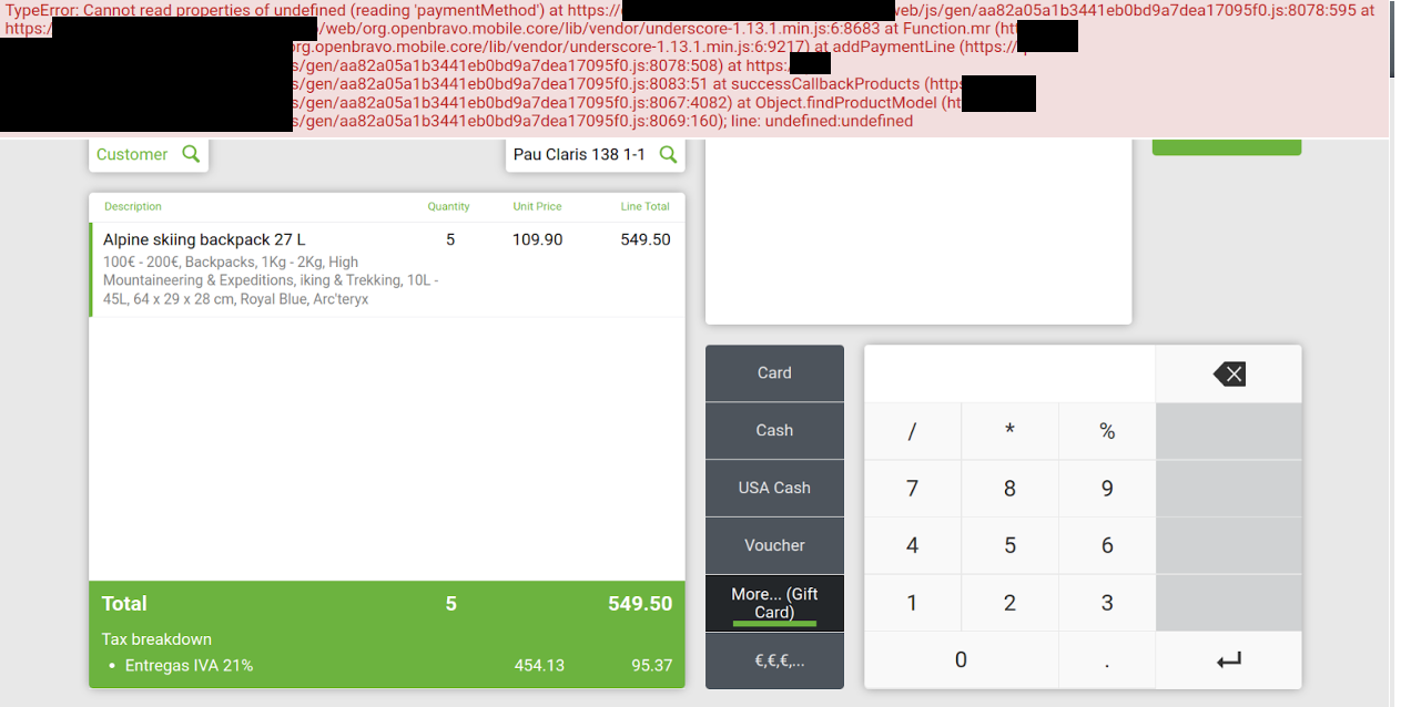 | Steps To Reproduce | Login to POS terminal, go to the login URL: http://{server}/{context}/web/org.openbravo.retail.posterminal/?terminal=VBS-1 [^] Enter login credentials: "Username": vallblanca "Password": openbravo The POS window will appear. To add product click “Browse” button Then select “Backpacks & Travel” category And from the product list select Product: Alpine skiing backpack 27 L Quantity: 5 And verify the below details Product: Alpine skiing backpack 27 L Quantity: 5 Unit Price: 109.90 Total line amount: 549.50 Total Gross Amount: 549.50 Tax Breakdown Tax percentage: Entregas IVA 21% Taxable Amount: 454.13 Total Tax amount: 95.37 To complete the receipt tap on the “Total” amount Verify “549.50 € remaining to pay” text appears on the right hand side of the terminal, along with “Ok” button Then select payment mehtod "Gift Card" (click on "More..." button if needed to bring it up) and click “OK” button Enter the card id "GC/001-1" and confirm it by clicking the Apply button Verify "Gift card 1" added to the product list with negative amount: -549.50 Total gross amount: 0.00 Total quantity: 6 Verify "Total is Zero. No payment needed“ label added to the screen To complete the receipt, tap on the “Done” button Observed result: An error message is displayed | |||||||