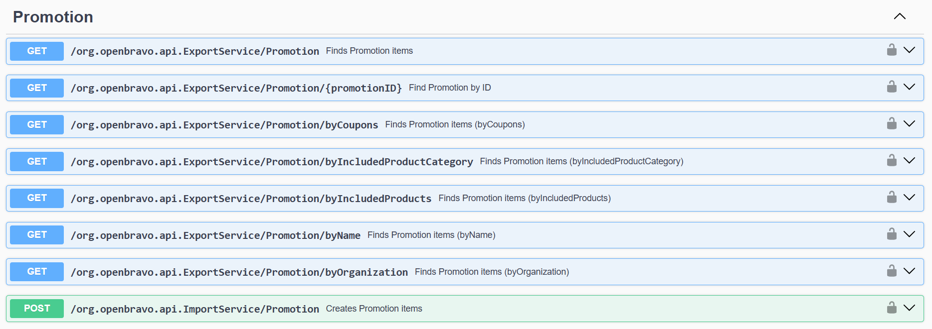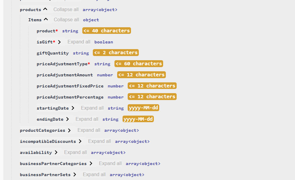 | Steps To Reproduce | Check in the swagger 1) Promotion (Export) object, product array 2) Promotion (Import) object, product array | |||||||