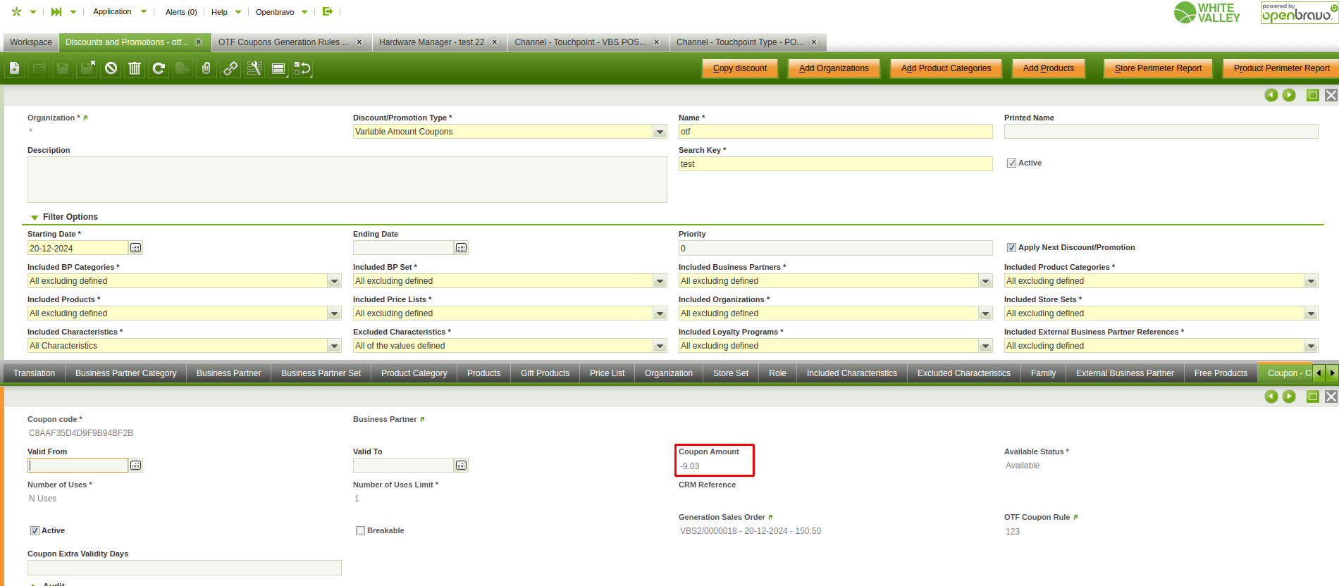 | Description | When zero/negative/greater than 100% values are entered as the 'Discount%' in the OTF Rule in the Backoffice, the rule is saved, and the OTF Coupon can still be generated and applied in the POS. In the Backoffice: 1. Go to 'Discounts and Promotions' window 2. Create a new discount with 'Variable Amount Coupons' promotion type 3. Fulfill the required fields 4. Tick 'Uses coupon codes' and 'Is OTF Coupon' flags 5. Activate the Promotion/Discount by clicking 'Activate the selected records' 6. Go to 'OTF Coupons Generation Rules' window 7. Create new Rule → Fulfill the following fields: - Applicant, Search Key, Description and Starting Date - Issuance Time: At Paid Time - Promotion/Discount: the one created above - Amount Rule: Percentage - Discount %: 0|-5|1000% - Number of Uses: N Uses - Number of Uses Limit - Active: ✔ 8. Proceed to 'Print' tab → Fulfill the required fields 9. Launch the HW manager | |||||||