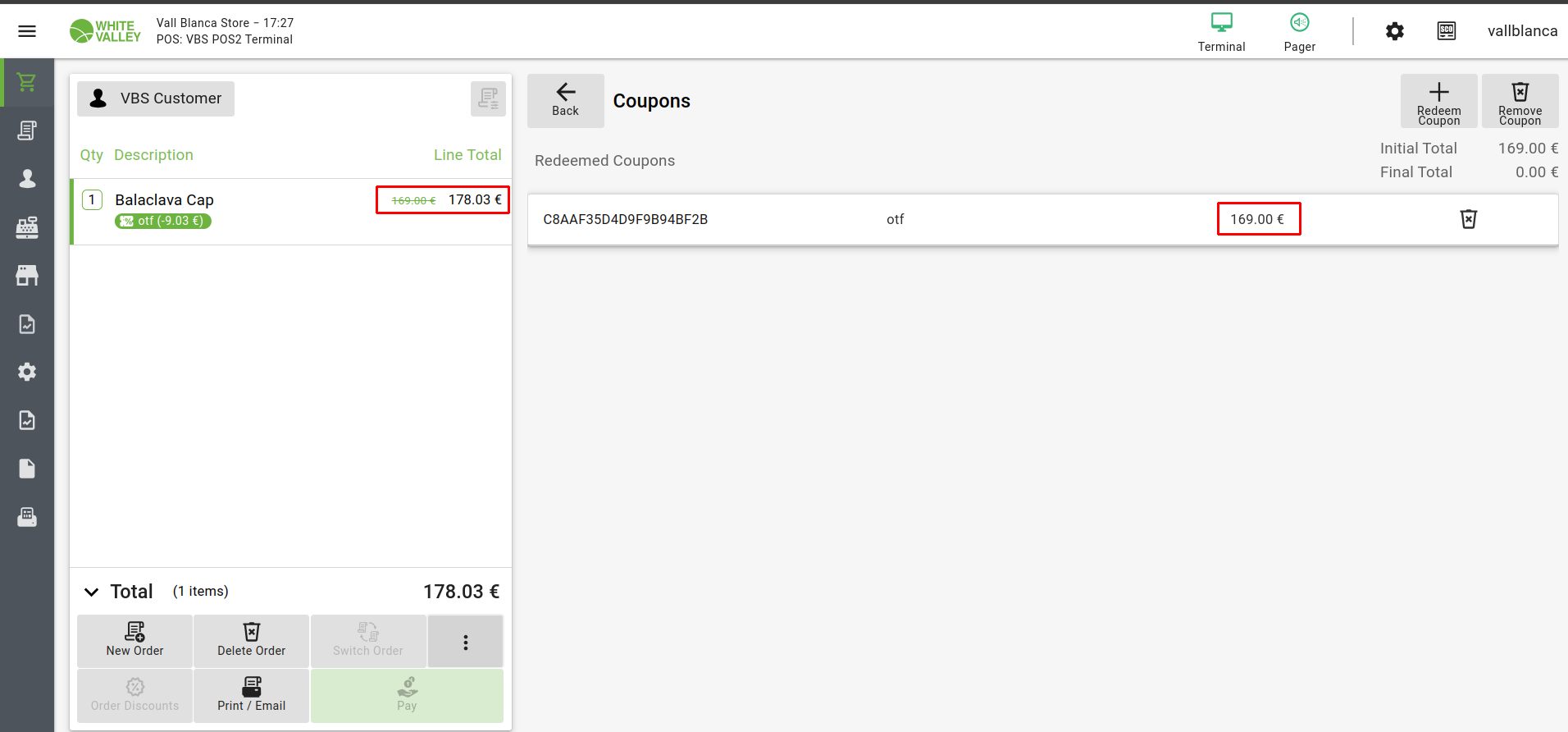 | Steps To Reproduce | 1. Login to POS (livebuilds:vallblanca/openbravo) 2. Add product to the Order 3. Complete the Order (Click 'Pay', select 'Cash' and click 'Done') 4. Select 'Print' delivery option 5. Verify the printed Coupon in the HW manager Actual Result: The Coupon is printed and saved in the BO (Discount Coupon window) with with the 'Amount' matching % of the Order Total per OTF Rule 6. Add product to the Order 7. Scan or redeem Coupon Code Actual Result: The coupon is applied | |||||||