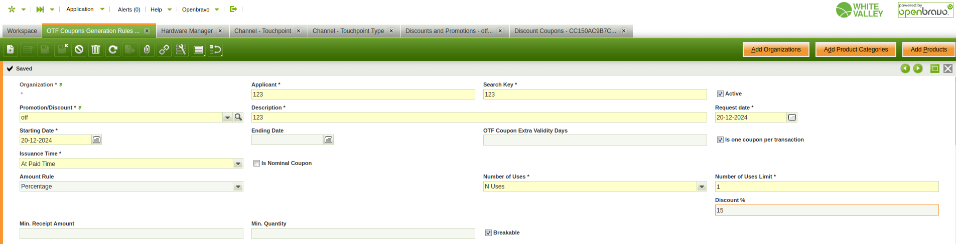 | Description | When 'Percentage' is selected as the amount rule, the 'Number of Uses' is set to 'N Uses' and 'Breakable' flag is enabled, the generated OTF Coupon is recorded in the back office with 'Infinite' number of uses In the Backoffice: 1. Go to 'Discounts and Promotions' window 2. Create a new discount with 'Variable Amount Coupons' promotion type 3. Fulfill the required fields 4. Tick 'Uses coupon codes' and 'Is OTF Coupon' flags 5. Activate the Promotion/Discount by clicking 'Activate the selected records' 6. Go to 'OTF Coupons Generation Rules' window 7. Create new Rule → Fulfill the following fields: - Applicant, Search Key, Description and Starting Date - Issuance Time: At Paid Time - Promotion/Discount: the one created above - Amount Rule: Percentage - Discount % - Number of Uses: N Uses - Number of Uses Limit - Active: ✔ - Breakable 8. Proceed to 'Print' tab → Fulfill the required fields 9. Launch the HW manager | |||||||