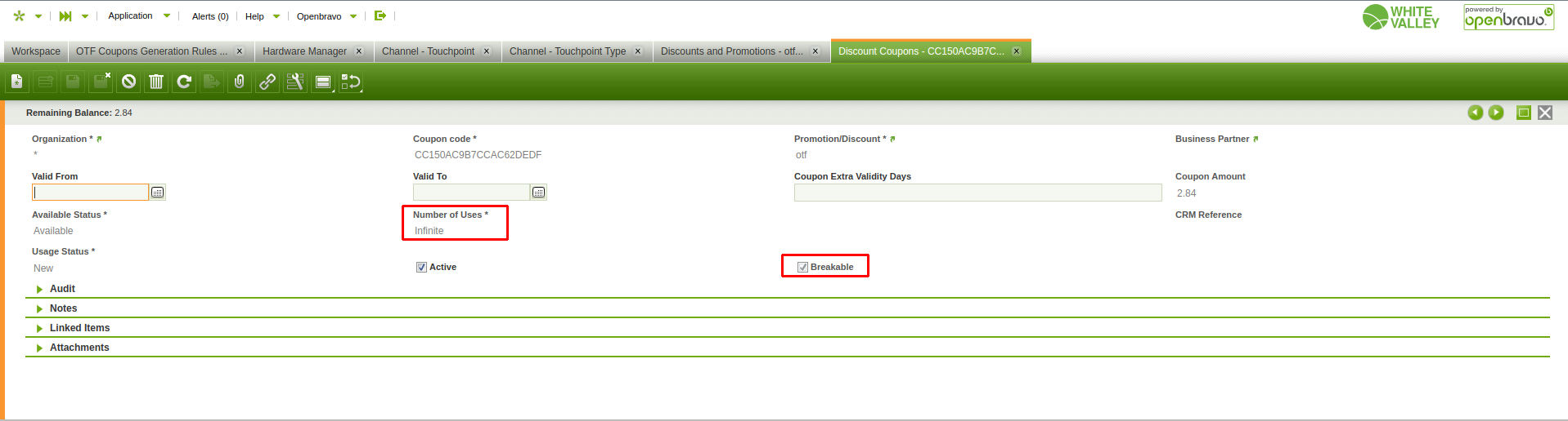 | Steps To Reproduce | 1. Login to POS (livebuilds:vallblanca/openbravo) 2. Add product to the Order 3. Complete the Order (Click 'Pay', select 'Cash' and click 'Done') 4. Log in to Backoffice 5. Go to 'Discount Coupons' window 6. Verify the generated Coupon Actual Result: The generated OTF Coupon is recorded with 'Infinite' uses, while being configured as 'N Uses' | |||||||