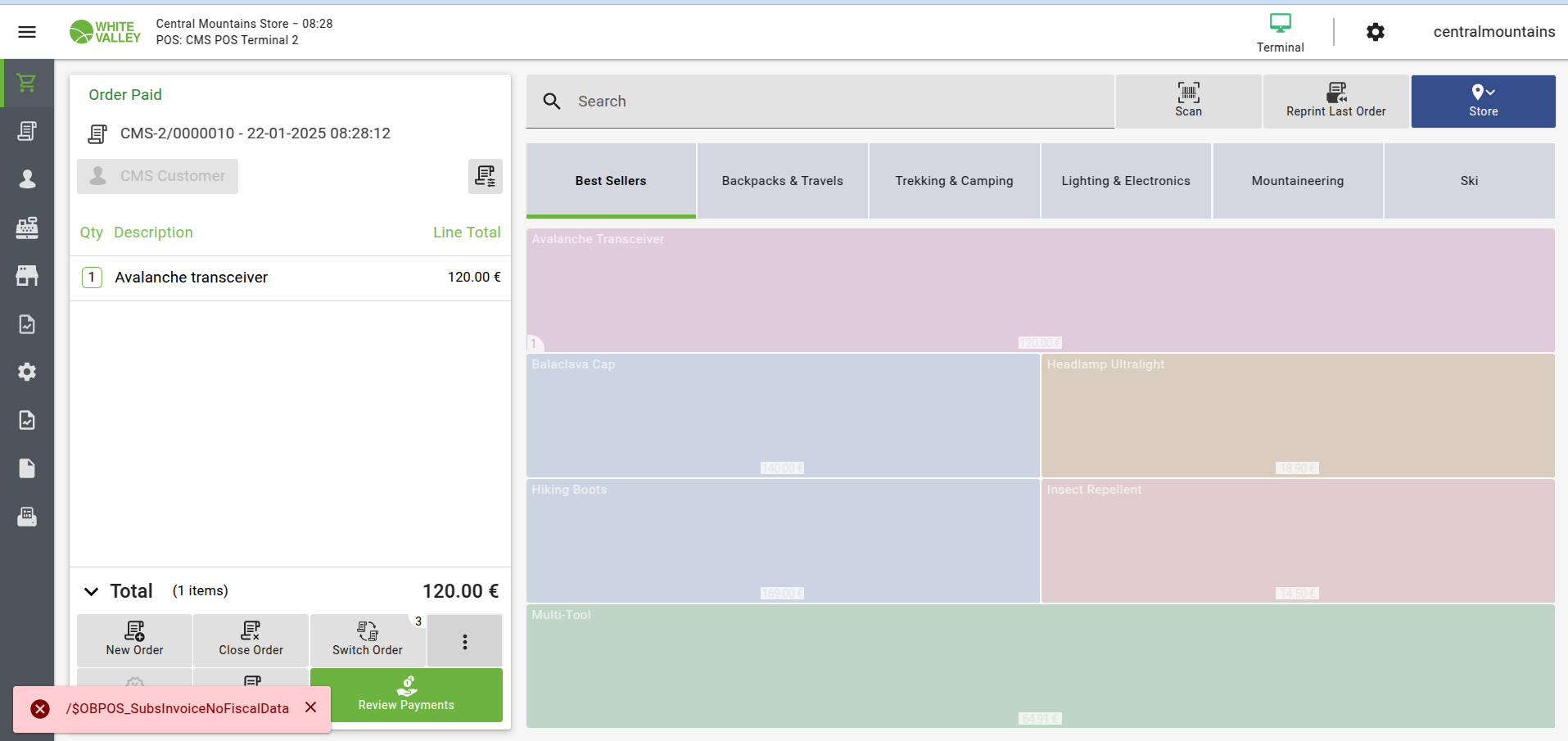 | Description | When Order is completed and opened form Orders list, on attempt to 'Issue Substitute Invoice' the '/$OBPOS_SubsinvoiceNoFiscalData' error is shown. While doing it directly form the Orders list works as expected and Substitute Invoice is created and printed To configure 'Issue Substitute Invoice' option follow the instructions in this file https://docs.google.com/document/d/1H92GKf337dzWwok8ziMVem2wcDZpueE0mRo6bys-FDA/edit?tab=t.0 [^] | |||||||