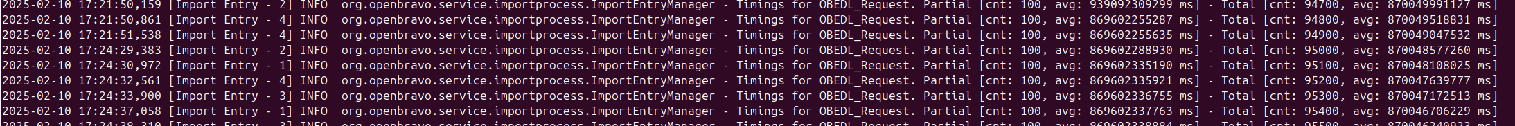 | Description | In several client instances that are executing massive imports of Products using the APIs, we detect that the timings of average processing time of the Import Entries shown in the log contains not realistic numbers (see the attached screenshot) | |||||||