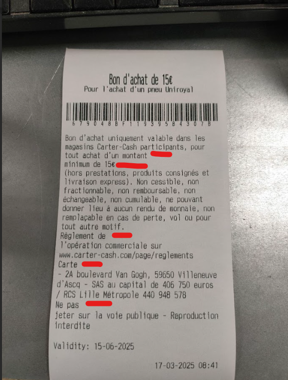 | Steps To Reproduce | Configure the text in There are some issues in the handling of ORF Coupons Generation Rules - Print subtab - field Print Description Bon d’achat uniquement valable dans les magasins Carter-Cash participants, pour tout achat d’un montant minimum de 15€ (hors prestations, produits consignés et livraison express). Non cessible, non fractionnable, non remboursable, non échangeable, non cumulable, ne pouvant donner lieu à aucun rendu de monnaie, non remplaçable en cas de perte, vol ou pour tout autre motif. Règlement de l’opération commerciale sur www.carter-cash.com/page/reglements Carter-Cash - 2A boulevard Van Gogh, 59650 Villeneuve d’Ascq - SAS au capital de 406 750 euros / RCS Lille Métropole 440 948 578 Ne pas jeter sur la voie publique - Reproduction interdite URL In case you need to copy directly: https://cartercash-recette.cloud.openbravo.com/openbravo/?tabId=837C7B53A45646818775C745F4693734&recordId=A4B4545C2B7C4CD480785DDDAB7F791E [^] The printed text is wrongly formatted | |||||||