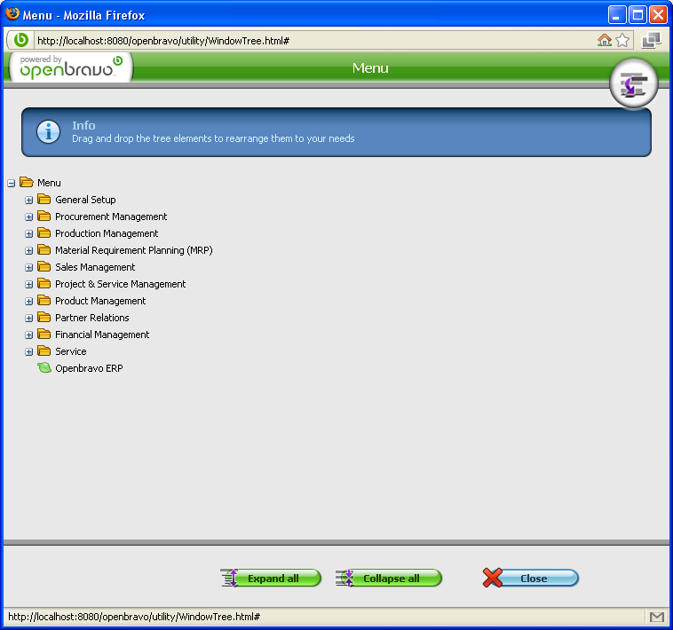 | Steps To Reproduce | General Setup || Application || Menu || Menu click on TREE button in toolbar move an important menu item (such as GENERAL SETUP) somewhere in the tree where it does not make sense and you would not find it back. Click CLOSE (thinking that this would NOT save it) Next time you use OB ERP, your nav item is gone. | |||||||||||