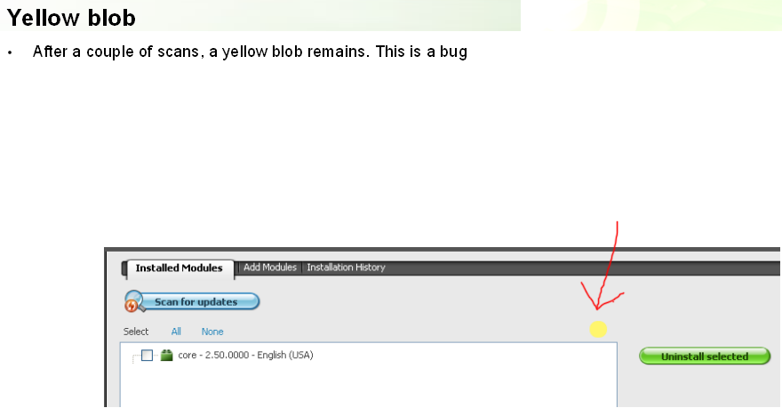 | Summary | 0006421: [Installed Modules] Yellow blob remains after a couple of scans | |||||||