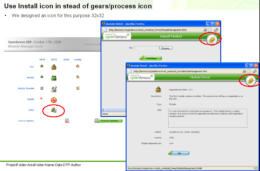 | Description | In the Install Module and Module Details the default gears icon is used. We have designed a nice module/pack/templates icon for this purpose though. | |||||||