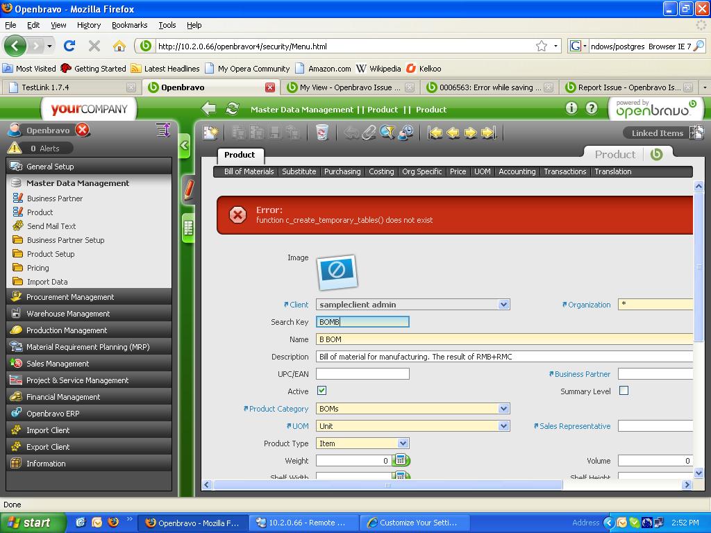 | Description | Clicking on Verify BOM button the following error is shown Error: function c_create_temporary_tables() does not exist Screen shot attached | |||||||