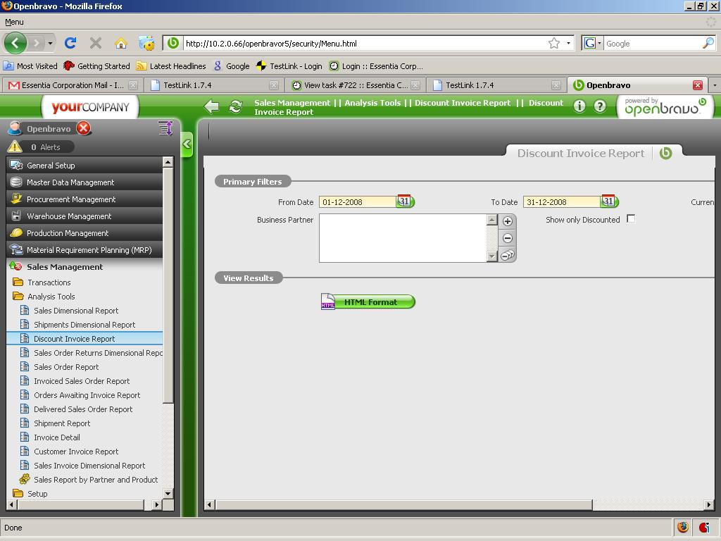 | Description | In Sales Management -> Analysis Tools -> Discount Invoice Report, Fill the mandatory fields and click the 'HTML Format' button shows error | |||||||