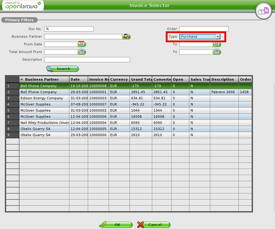 DescriptionInvoice and Order selectors have a Type filter drop-down list with the following values: