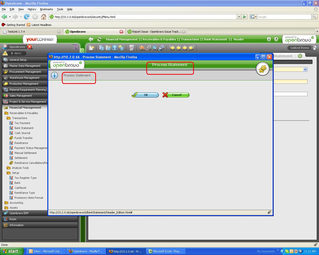 | Steps To Reproduce | # Login as userA # Go to financial management->Receivables and payables->Transactions -> Bank Statement # Click New & Enter the description.Save that. # Click "Process" button.A popup window opens and the title of that window is "Process Statement". # The statement will be processed. # Now try to Unprocess the statement by clicking the "Unprocess" Statement again a popup window opens & the title of that window is "Process Statement" | ||||||||||