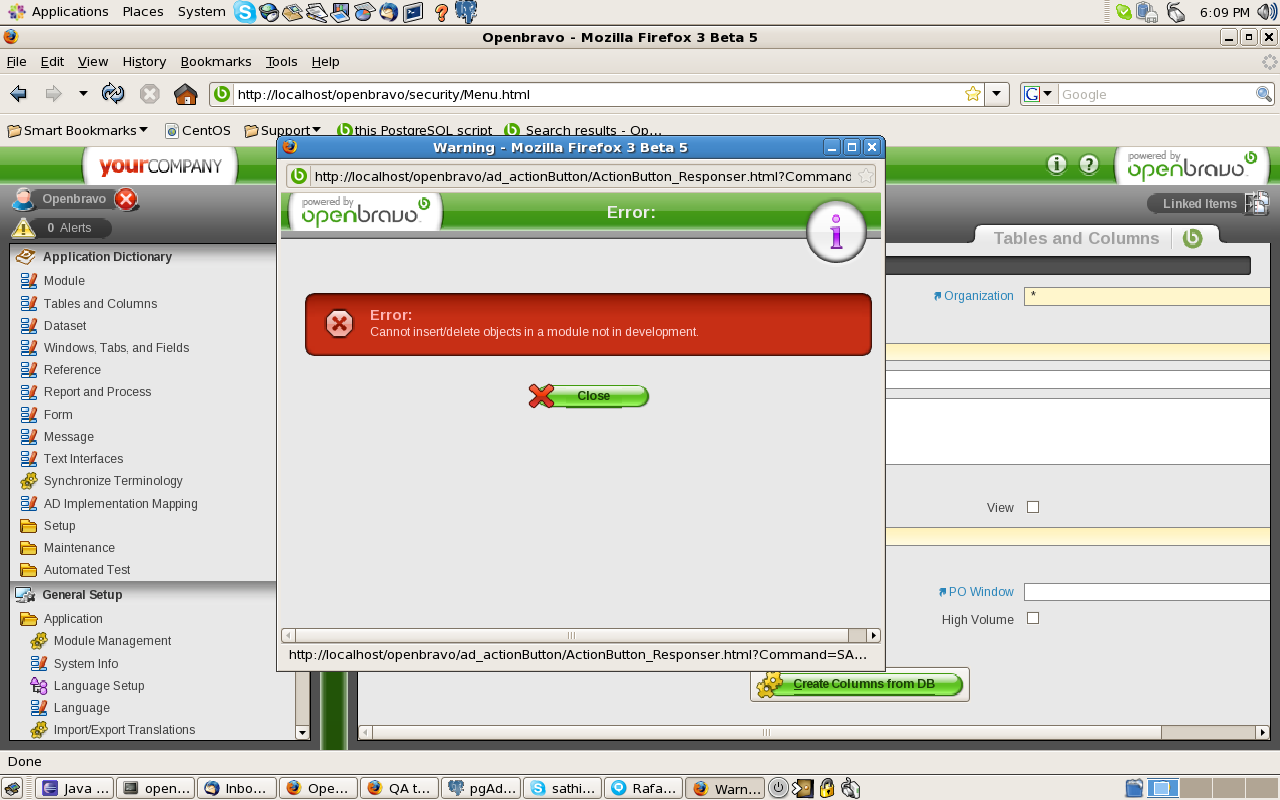 If I select/mark core(top module from Openbravo) as “In Development”, I don't get the error. I am able to continue the rest.