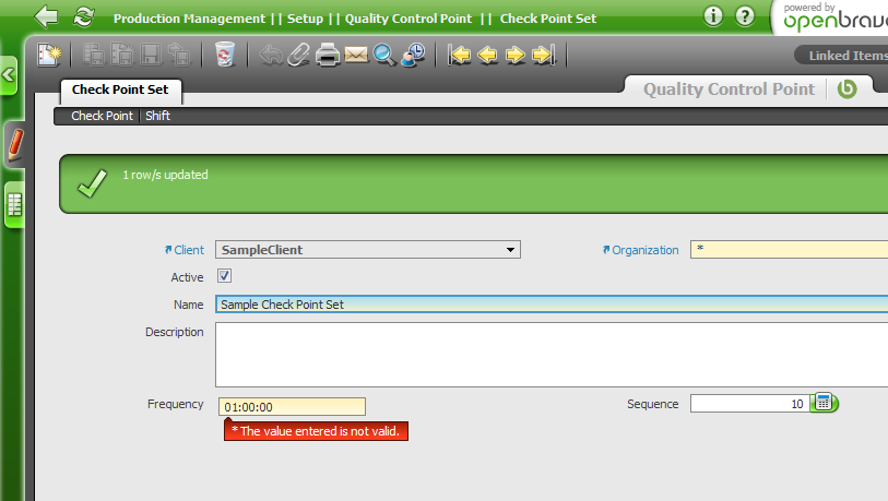 | Steps To Reproduce | 1. Go Production management > Setup > Check Point Set 2. Create a new Check Point Set, on the Frequency enter only the hour, 1. 3. Move away from the field. A message is shown about an invalid value. 4. Save. The record is saved and Frequency is correctly interpreted as 01:00:00. See attach. | |||||||