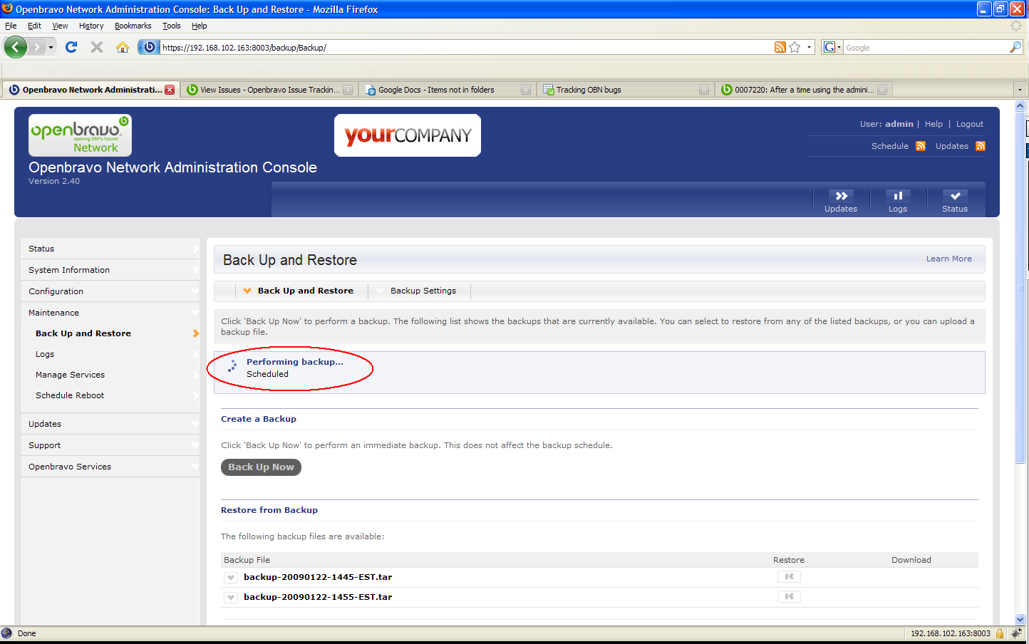 Some windows that are not available are: Configuration Configure Networking System Time Maintenance Logs Manage Services Updates View and Apply Rollbacks The log we get is the following: The traceback is: Traceback (most recent call last): File "/usr/lib64/python2.4/site-packages/raa/vendor/CherryPy-3.0.3/cherrypy/_cprequest.py", line 551, in respond File "/usr/lib64/python2.4/site-packages/raa/vendor/CherryPy-3.0.3/cherrypy/_cpdispatch.py", line 24, in __call__ File "/usr/lib64/python2.4/site-packages/raa/web/__init__.py", line 274, in inner_wrap ret = func(*args, **kwargs) File "/usr/lib64/python2.4/site-packages/raa/web/__init__.py", line 223, in inner_expose return func(*args, **kw) File "/usr/lib64/python2.4/site-packages/raa/authenticate.py", line 82, in inner_require return func(self, *args, **kwargs) File "/usr/lib64/python2.4/site-packages/raaplugins/services/web/services.py", line 221, in index statuses = self.callBackend('getServiceStatuses', [x[0] for x in srvs]) File "/usr/lib64/python2.4/site-packages/raa/modules/raawebplugin.py", line 516, in callBackend triggerImmed(schedId) File "/usr/lib64/python2.4/site-packages/raa/modules/raawebplugin.py", line 38, in triggerImmed client.connect( cfg.listenerFile ) File "<string>", line 1, in connect error: (111, 'Connection refused') |