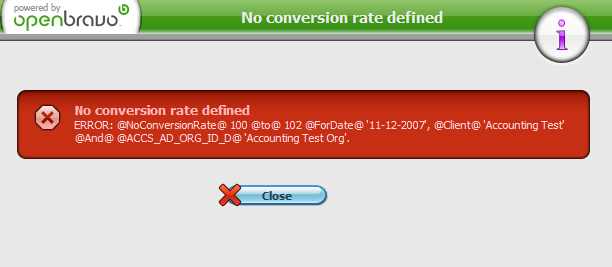 | Description | I have a client with standard data (Smoke Test was followed). When I launch the Project Profitability report with standard filter, I get an error: No conversion rate defined ERROR: @NoConversionRate@ 100 @to@ 102 @ForDate@ '11-12-2007', @Client@ 'Accounting Test' @And@ @ACCS_AD_ORG_ID_D@ 'Accounting Test Org'. and the report is not displayed. | |||||||