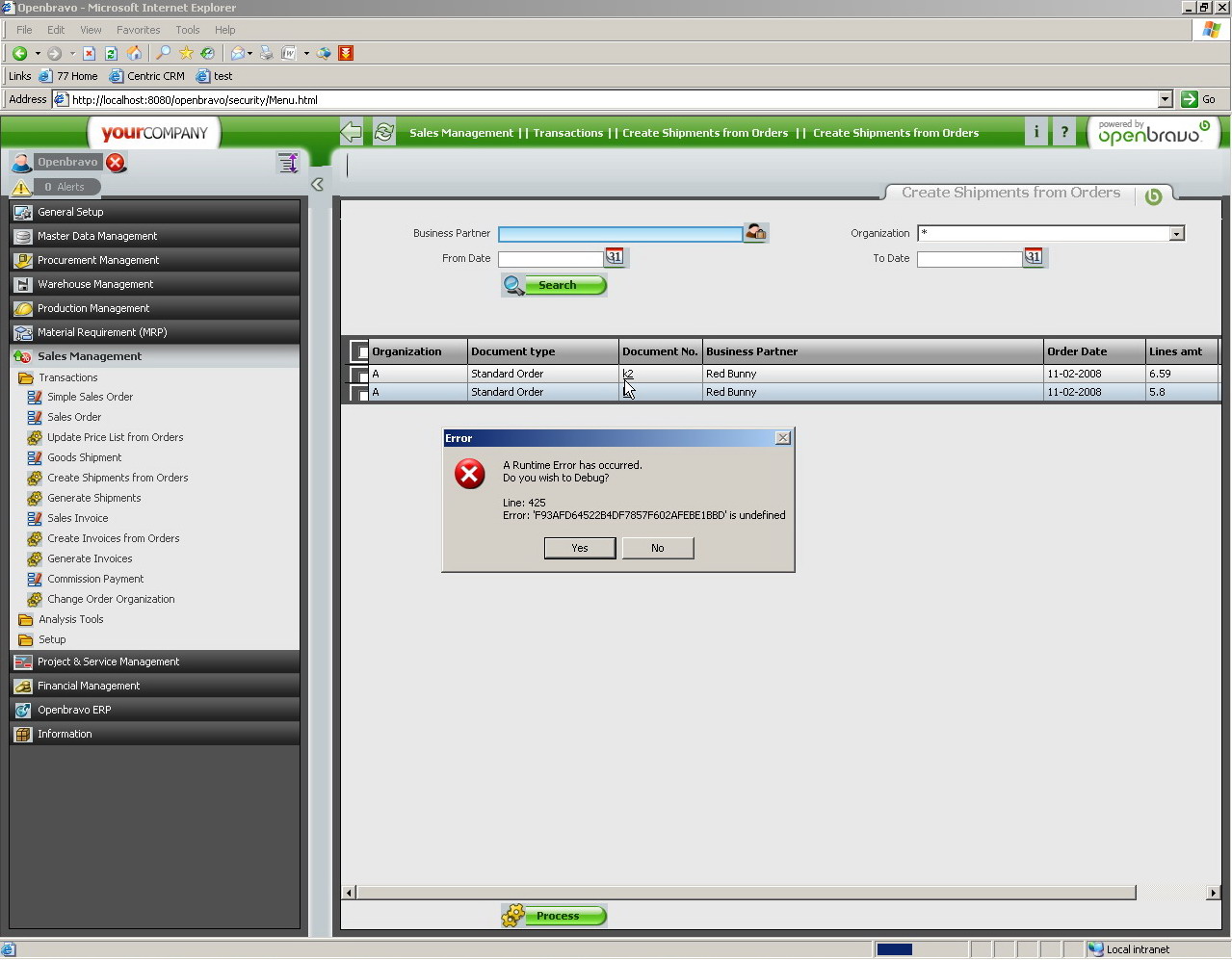 | Description | JavaScript error in 'Create Shipments from Order' Form This problem is caused by alpha-numeric uuids generated for new records. For 'old' numeric ids everything works ok. Notice that screen shots show error in Internet Explorer, but it is reproducible in FireFox. | |||||||