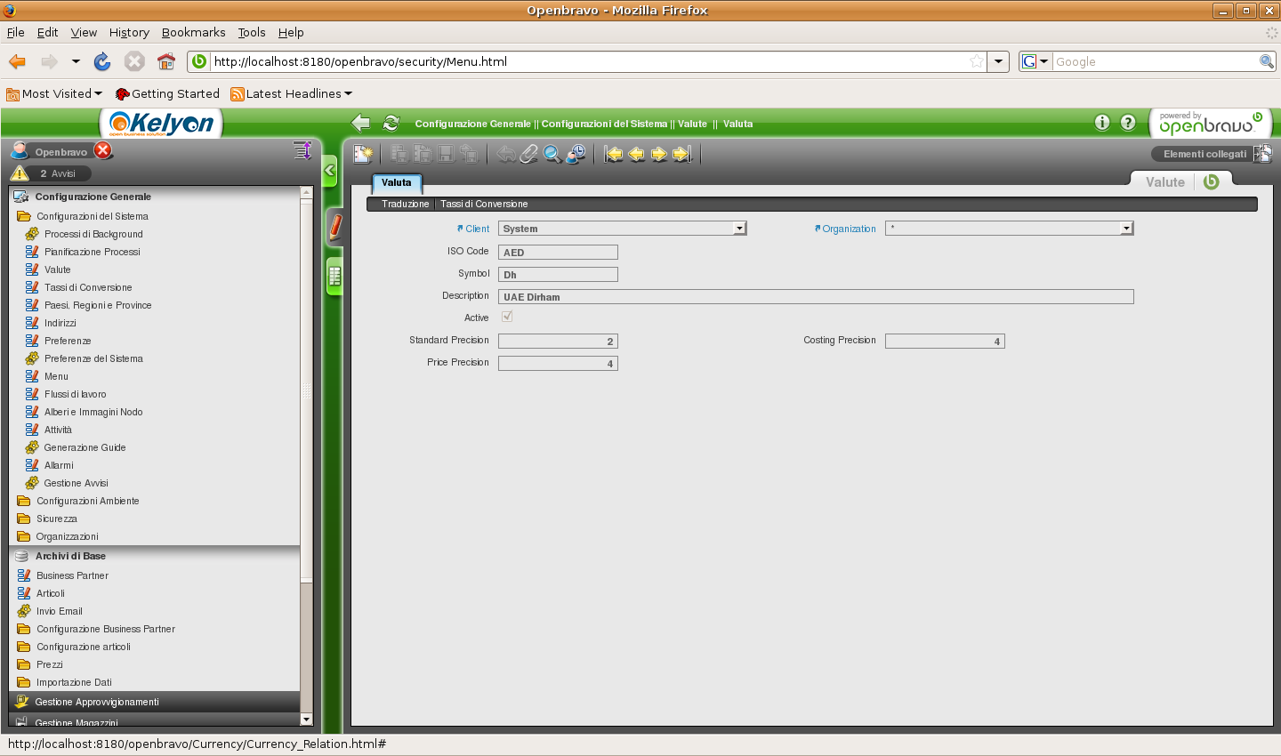 I've tested again and I cannot see this behavior, see attached file (itIT-valuta-admin.png), it is how I see the valuta window as Openbravo Admin (as System I also see it translated). Is it happening only in read-only tabs? If it is so, it might be caused by this issue 0005154, which is already fixed in r2.40 branch. I would like to do another remark. Note that in the picture I've attached every label is translated except "Price precision". I've noticed this label was translated in the AD_FIELD_TRL_it_IT.xml, but it is not in AD_ELEMENT_TRL_it_IT.xml. As this field is centrally maintained, its value is replaced with the element's value when synchronize terminology process is run. I guess this also could be the problem you report about losing some translated labels. I encourage you to follow the note in http://wiki.openbravo.com/wiki/index.php/Translating_Openbravo#Structure [^] document where it recommends to first translate elements, then synchronize terminology and finally translate fields. Anyway there is a reported issue about it: 0008151. Please, let me know if this solves your problem. Thank you. |