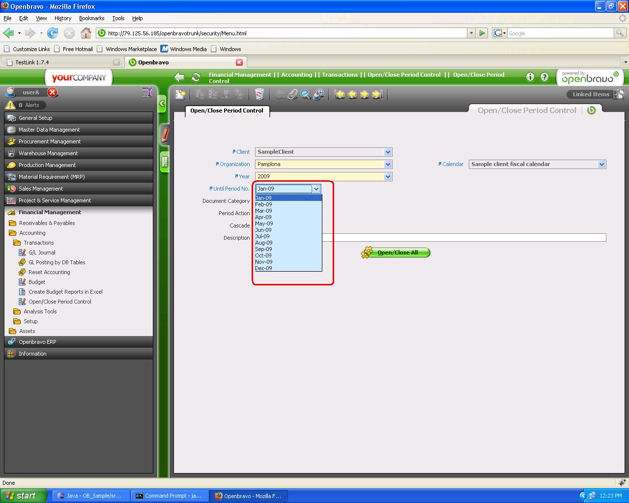| Steps To Reproduce | # Login as userA # Go to Financial management->Accounting->Transactions->Open/Close period control # Click new and select: # Organization: Pamplona # Calendar: Sample client fiscal calendar # Until period No.: Here the nos should be displayed from 1 - 12. But instead of that Period names are displayed from Jan 09 - Dec 09. | |||||||