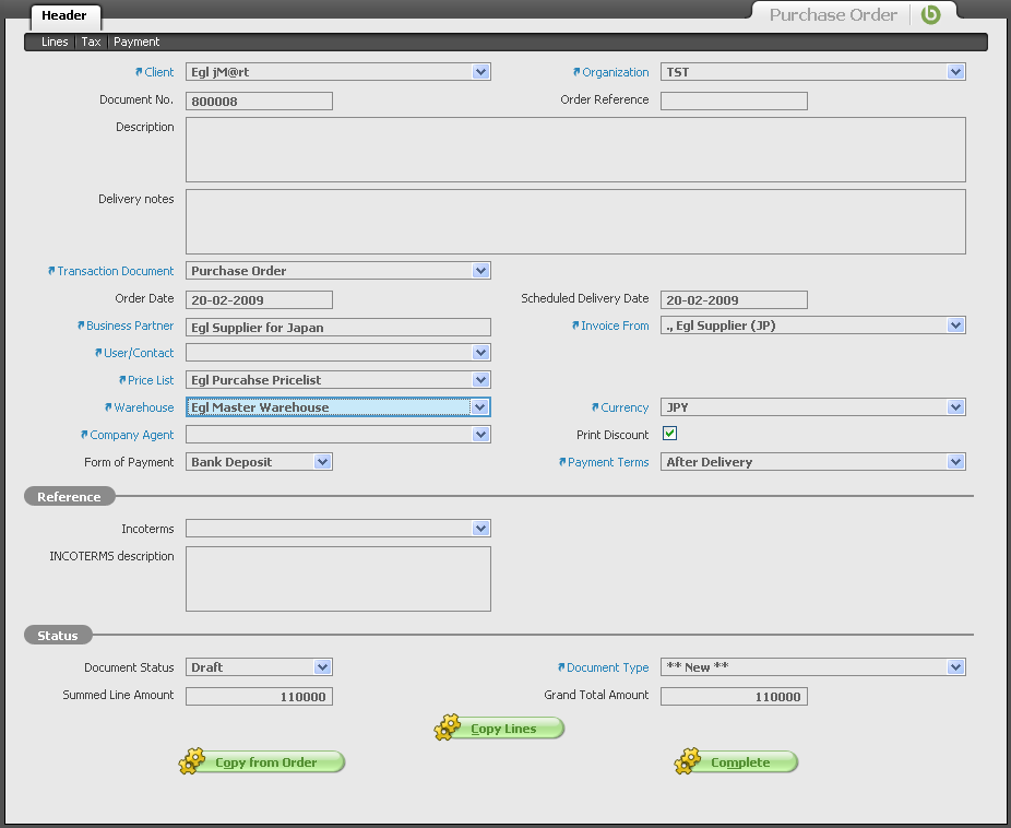 | Description | After create PO from "Requisition to Order", view Purchase Order but cannot editable. "Copy Line", "Copy from Order" and "Complete" button are blurred, unable to click (please see attachment of screen capture). When I click the print button on the menu bar, it throws ArrayIndexOutOfBound Exception. This is the one and only one Purchase Order exists on my system. Exception from TC6.0: [http-9001-1] ERROR org.openbravo.erpCommon.utility.reporting.printing.PrintOrders - Error captured: java.lang.ArrayIndexOutOfBoundsException: 0 | |||||||