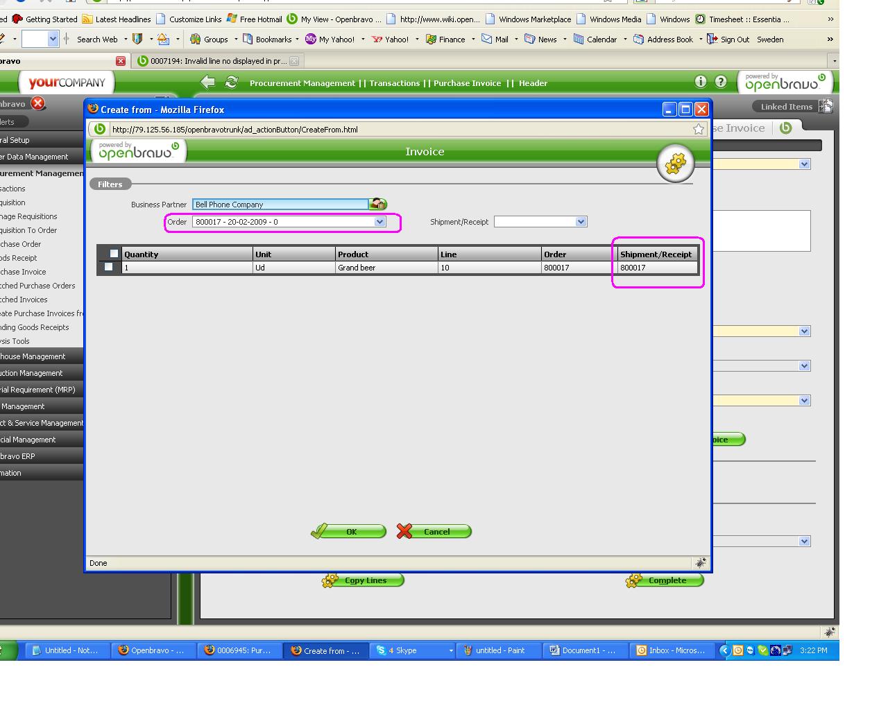 | Summary | 0007710: Purchase order doc no wrongly displayed under Shipment/Receipt cloumn when invoice lines are created using 'create lines from' | |||||||