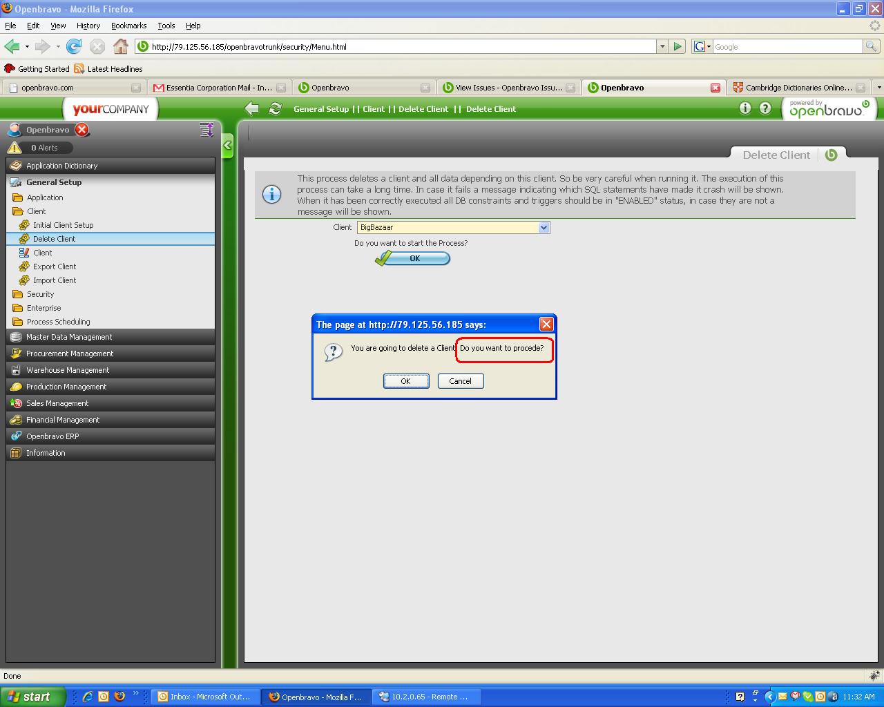 | Steps To Reproduce | Login as Openbravo/openbravo. Go to General Setup -> Client -> Delete Client. Select the client Big Bazaar from the client combo box. Click "Ok" button. A popup message will be displayed "You are going to delete a client. Do you want to procede" with Ok & Cancel buttons. | |||||||