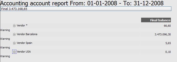 | Steps To Reproduce | 1. Go Financial Management > Accounting > Analysis Tools > Trial Balance Report 2. Enter some filters to get data. 3. Click HTML Format button 4. The report is shown, there are some "Anal." links. Click one. 5. A new window opens and expanding each business partner you can see a "warning" label. | |||||||
