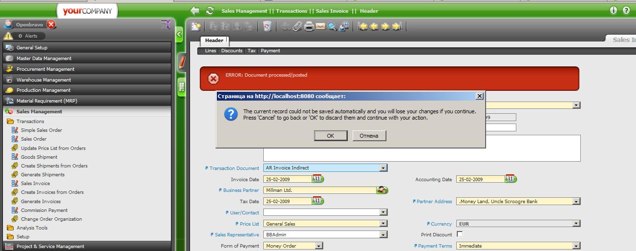 | Description | AutoSave process fails if it is invoked on processed documents created by automatic OpenBravo processes (e.g. Sales Invoice created by c_order_post process form POS Sales Order) For documents created manually from GUI everything works fine. | |||||||