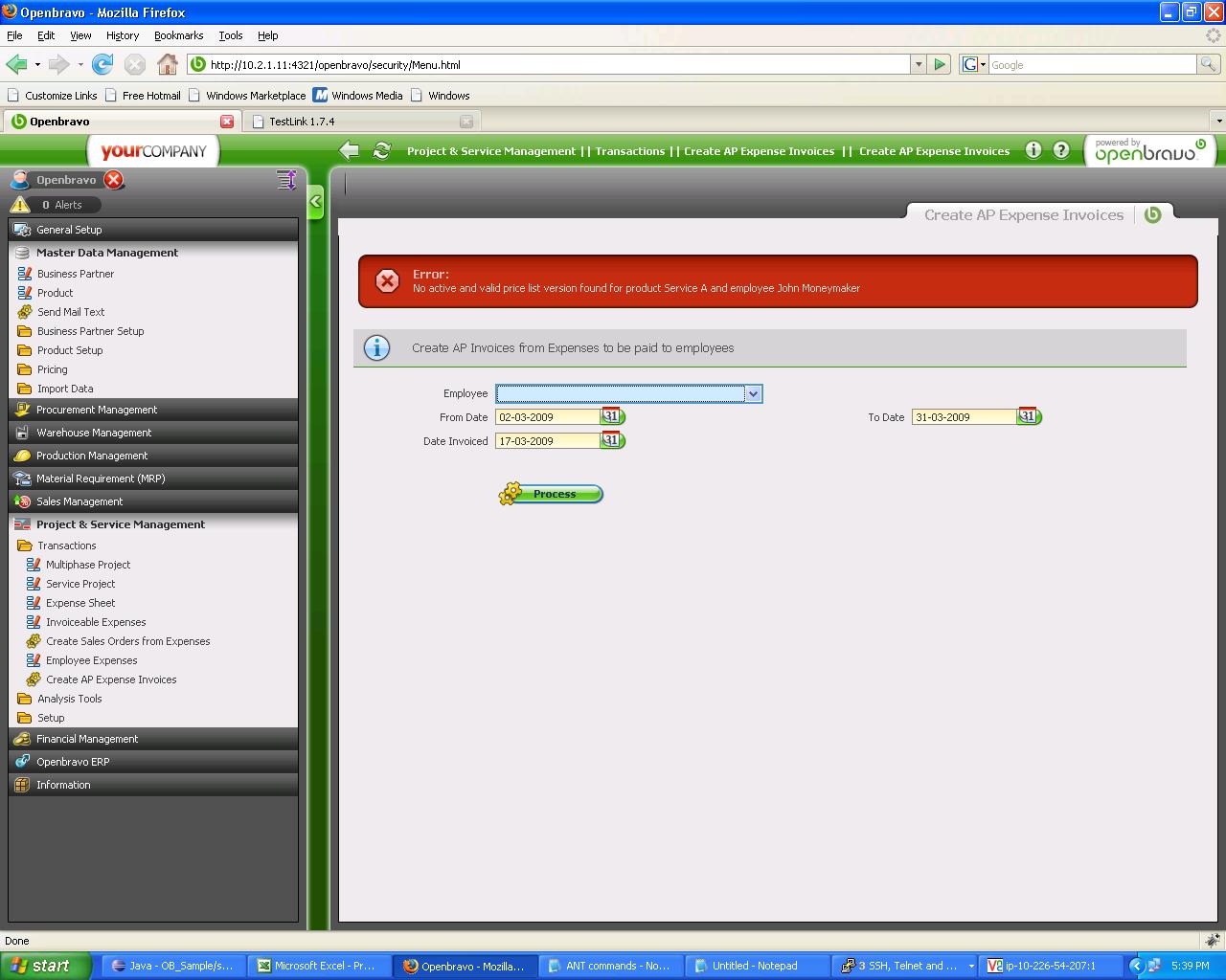 | Steps To Reproduce | Precondition : In the purchase pricelist the product Service A is not added Steps to reproduce: # Login as userA # Go to Project & Service Management->Transactions->Employee Expenses # Select Employee A employee. # Check that: * Purchase Price List: PURCHASES * Payment Terms: 30 days, 5 # Go to Lines tab. # Select first Service A line and check that: * Reinvoicing: Checked * Quantity: 1 * UOM: Day * Expense Amount: 1 * Project: cca - Consultancy for Customer A * Business Partner: Customer A * Project Phase: Project delivery * Project Task: Project presentation # Select second Service A line and check that: * Quantity: 2 * UOM: Day * Expense Amount: 2 * Project: sca - Service Project for Customer A * Business Partner: Customer A # Go back to Employee tab # Go to Project & Service Management->Transactions->Create AP Expense Invoices # Edit: * Employee: Employee A * From Date: 01-01-2000 * To Date: 01-12-2011 * Date Invoiced: 01-07-2008 # Click on Process button. An error message is displayed like "No active and valid price list version found for product and employee EMPLOYEE A" | |||||||