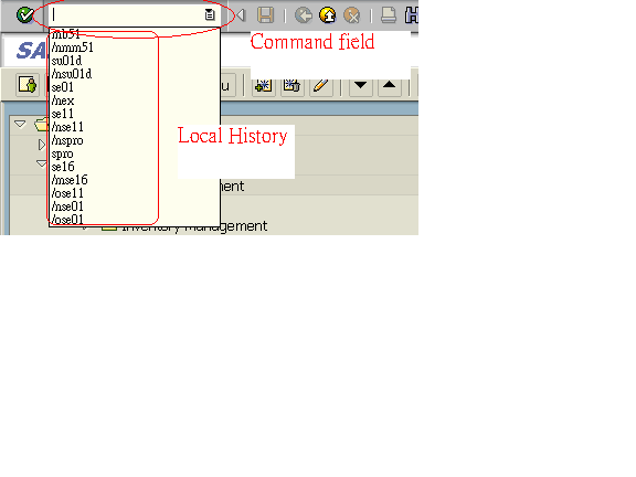 More info: Help info of the command field Command field You can execute the following commands in this field with Enter: o To call a transaction - in the same session (window) Enter: /nxxxx (xxxx = transaction code). - in the same session (window), whereby the initial screen is skipped. Enter: /*xxxx (xxxx = transaction code). - in an additional session, Enter: /oxxxx (xxxx = transaction code). o To end the current transaction Enter: /n. Caution: Unsaved changes are lost without warning o To delete the current session. Enter: /i. o To generate a session list Enter: /o. o To end the current transaction and return to the starting menu Enter: /ns000. o To log off from the system Enter: /nend. o To log off from the system without a confirmation prompt Enter: /nex. Caution: Changes that were not saved are lost without warning. |