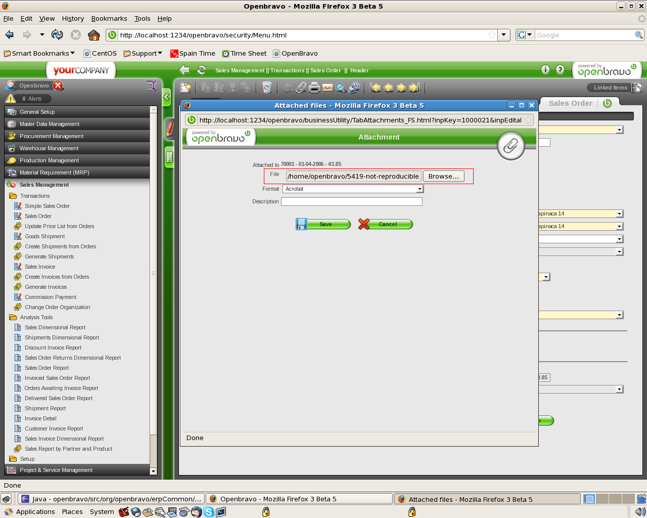 | Steps To Reproduce | 1. Login as Openbravo admin 2. Go to Sales management 3. Click on Sales order under Transactions. 4. Click on "Attach a file" (Clip Icon) in the top of Header page. 5. When click on clip icon, The attachment pop up will appear. 6. Then click on add button in Attachment pop up Window. | |||||||