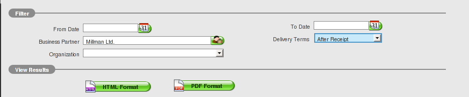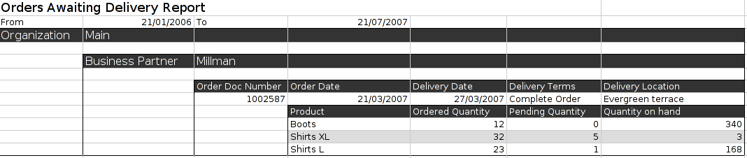 | Proposed Solution | Following current report 'Orders Awaiting Invoice Report' structure (Sales Management || Analysis Tools || Orders Awaiting Invoice Report), create a report with the following filters (see attached OADRfilter.png): * From Date * To Date * Business Partner * Delivery Terms * Organization Display the following data (see attached OADRreport.png): * From To (Subtitle) * Organization (Level 1) * Business Partner (Level 2) * Order Doc Number (Level 3) * Order Date (Level 3) * Delivery Date (Level 3) * Delivery Terms (Level 3) * Delivery Location (Level 3) * Product (Level 4) * Ordered Quantity (c_orderline.qtyordered - Quantity ordered) (Level 4) * Pending Quantity (c_orderline.qtyordered - c_orderline.qtydelivered - Quantity pending to be delivered) (Level 4) * Quantity on hand (m_storage_detail.qtyonhand - Quantity on stock) (Level 4) Other data that could be shown: * Pre-Quantity (m_storage_detail.preqty - Transactions in draft status) (Level 4) * Pending Receipts (m_storage_pending.qtyordered - Sum of all quantities which have been purchased but not received) (Level 4) * Pending Shipments (m_storage_pending.qtyreserved - Sum of all quantities which have been sold but not received) (Level 4) | |||||||