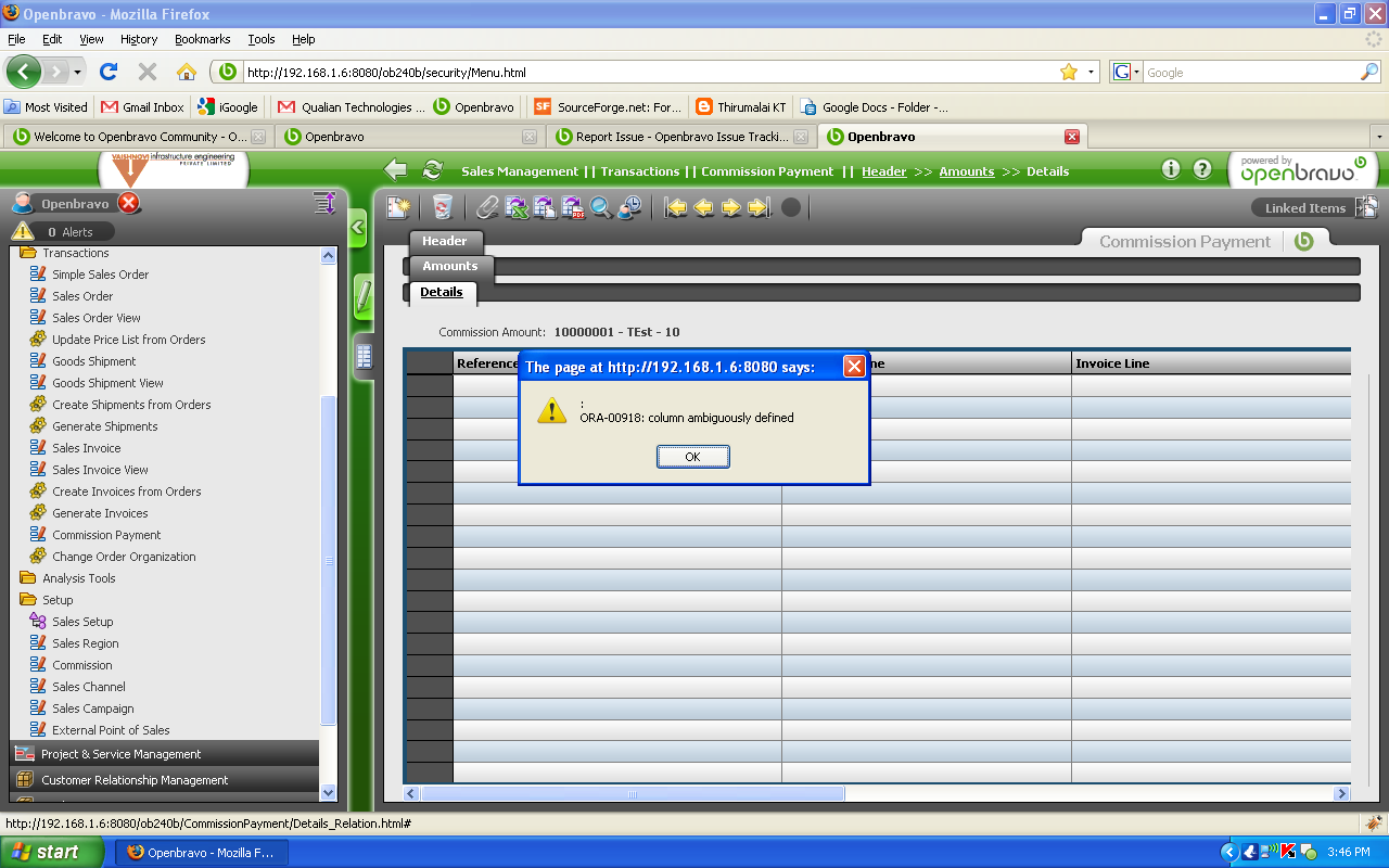 | Steps To Reproduce | 1.Sales management >> Setup >> Sales commission 2.Create a header and process Generate commission. 3.It shows commission payment document no. 4.Retrieve that document no in Sales Management >> Transactions >> Commission Payment 5.Go to Header >> Amounts >> Details Grid view says -->ORA-00918: column ambiguously defined | |||||||