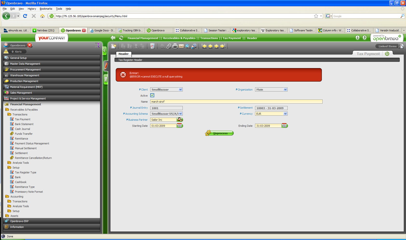 | Steps To Reproduce | 1. Financial Management || Receivables & Payables || Setup || Tax Register Type Create a Register for Sales Tax (Sales Transaction selected), Tax VAT 16%, Document Type=AR Invoice and for Purchase Tax, Tax VAT 16%, Document type=AP Invoice 2. Create a Sales Invoice (AR Invoice, BP Mc giver, Product=shirts, invoiced qty=1, price=100) and complete 3. Create a purchase invoice (AP Invoice, BP Mafalda, Product=shirts, invoice qty=1, price=1000) and complete 4. Financial Mgmt || Receivables & Payables || Transactions || Tax Payment: starting date=first date of the month, end date=last date of the month 5. Select 'Generate Payment' 6. Click 'Create VAT Registers' 7. Process 8. Unprocess The Tax Register Header information looked fine and processing works but when unprocessing I got the error. SEE ATTACH Also exists another error. When you click "create payment" and save and then you click "Create VAT Register" you lose what you have marked | |||||||