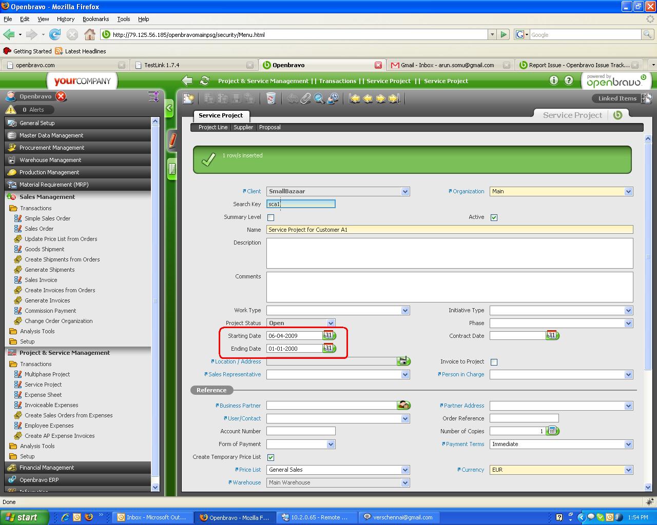 | Steps To Reproduce | # Go to Project & Service Management->Transactions->Service Project # Click New and fill: * Search Key: sca * Name: Service Project for Customer A * Enter the Starting Date as 06-04-2009 and Ending Date as 01-01-2009 * Save the record. | |||||||